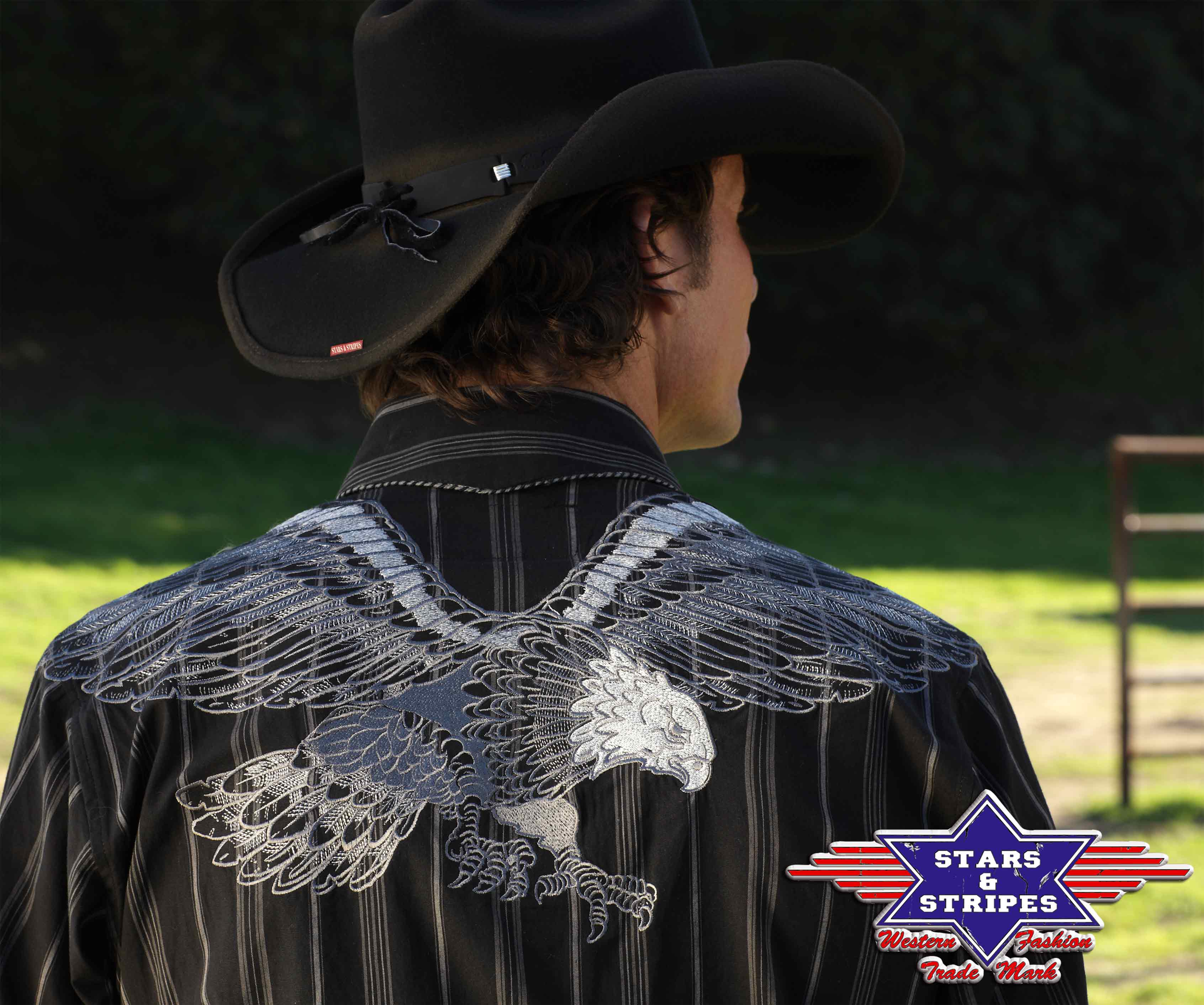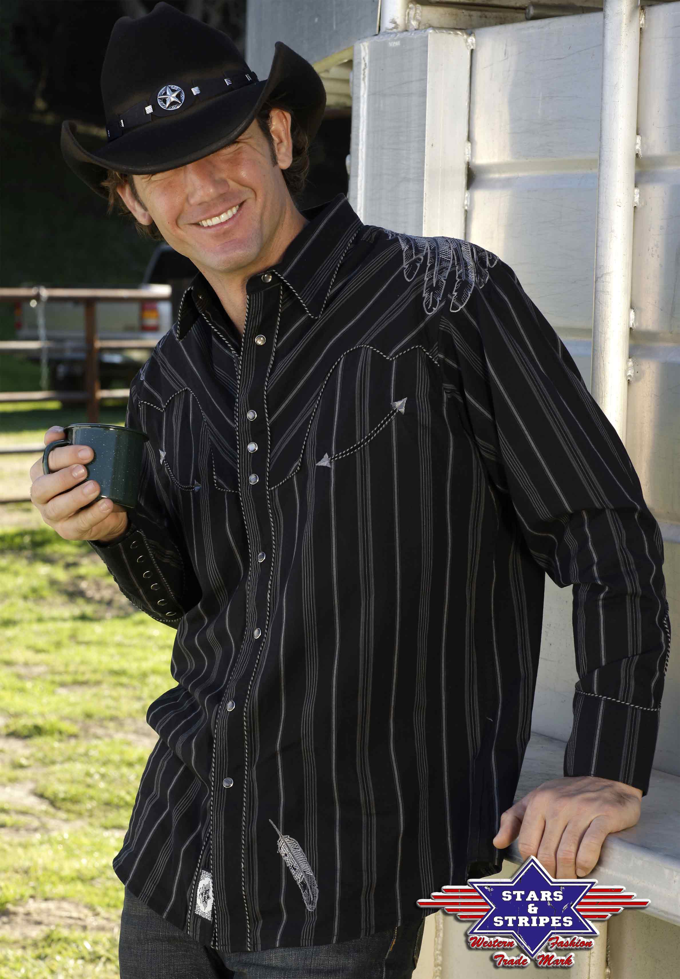 | Besonderheit: | Adlerstickerei, gestickte Feder am vorderen Hemdsaum, Westernmanschetten, Perlmutt-Druckknöfe |